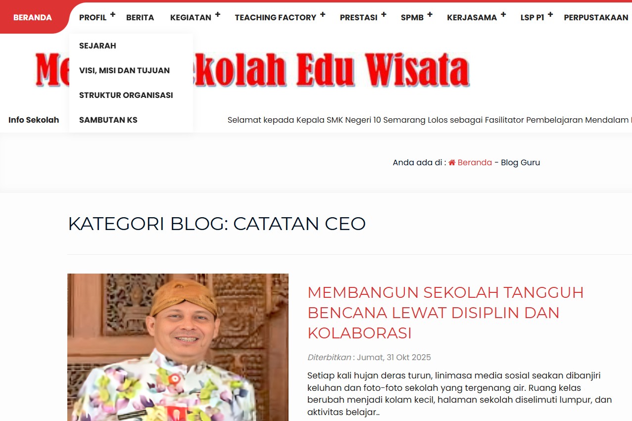 Penulis sebagai kepala sekolah membuat Catatan CEO SMKN 10 Semarang, sebuah proyek literasi kepemimpinan yang telah menghasilkan lebih dari 130 artikel. Setiap tulisan memotret dinamika kepemimpinan, inovasi, dan refleksi pendidikan di tingkat sekolah. Konsistensi ini menjadi bukti bahwa menulis bukan pekerjaan sambilan, tetapi bagian integral dari proses memimpin dan belajar seumur hidup.