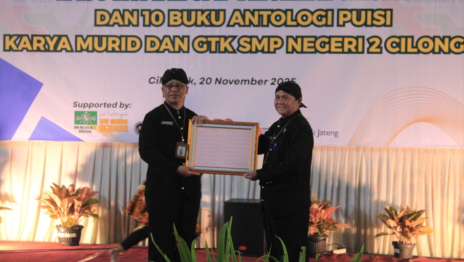 Apresiasi tinggi juga disampaikan perwakilan Dinas Pendidikan Kabupaten Banyumas, Purnomo Hesti Wijayanto, S.Pd., M.Pd. Dalam sambutannya, ia menyatakan kekagumannya terhadap capaian sekolah. “Kami sangat mengapresiasi lahirnya Himne SMP Negeri 2 Cilongok dan terbitnya sepuluh buku antologi puisi. Dua karya monumental ini diluncurkan dalam satu momentum yang sama, dan itu luar biasa,” ujarnya. Ia berharap inovasi dan semangat berkarya ini terus tumbuh demi kemajuan pendidikan di Banyumas.